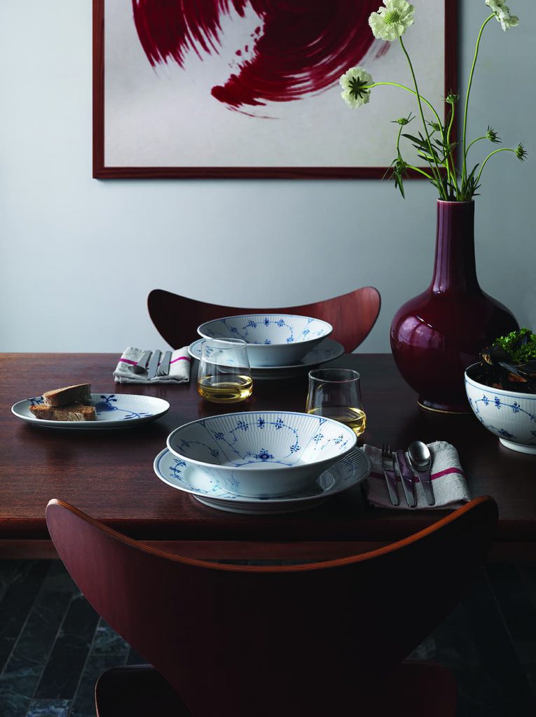 Created in 1775, Royal Copenhagen’s Blue Fluted Plain range was their first ever pattern. This classic blue floral design is still being produced today, with every piece of porcelain treated as a piece of art, carefully painted by hand (www. royalcopenhagen.com).