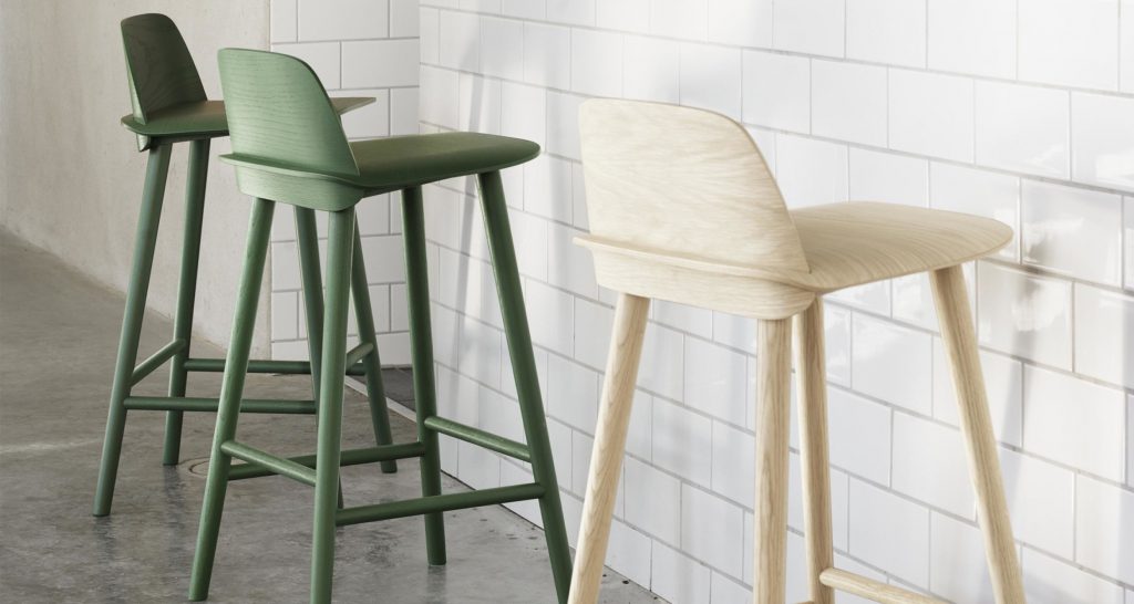 The comfortable Nerd counter and bar stool from Muuto features a sleek Scandinavian design and is ideal for a bar, restaurant, hotel or kitchen. It is shown here with Muuto’s Base High Table.