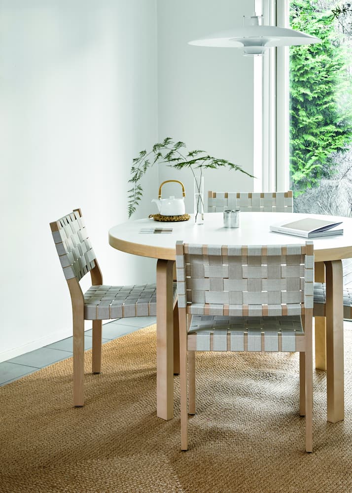 The Aalto table and Chair 611 from Artek are a match made in heaven. The Chair 611 has a solid birch frame with a linen