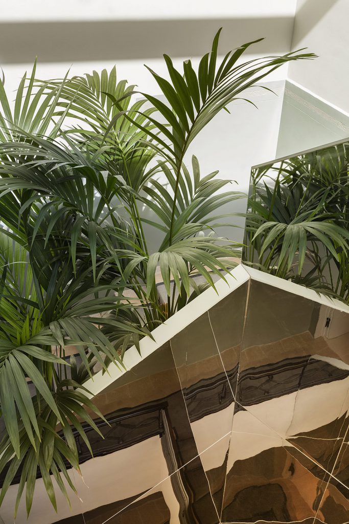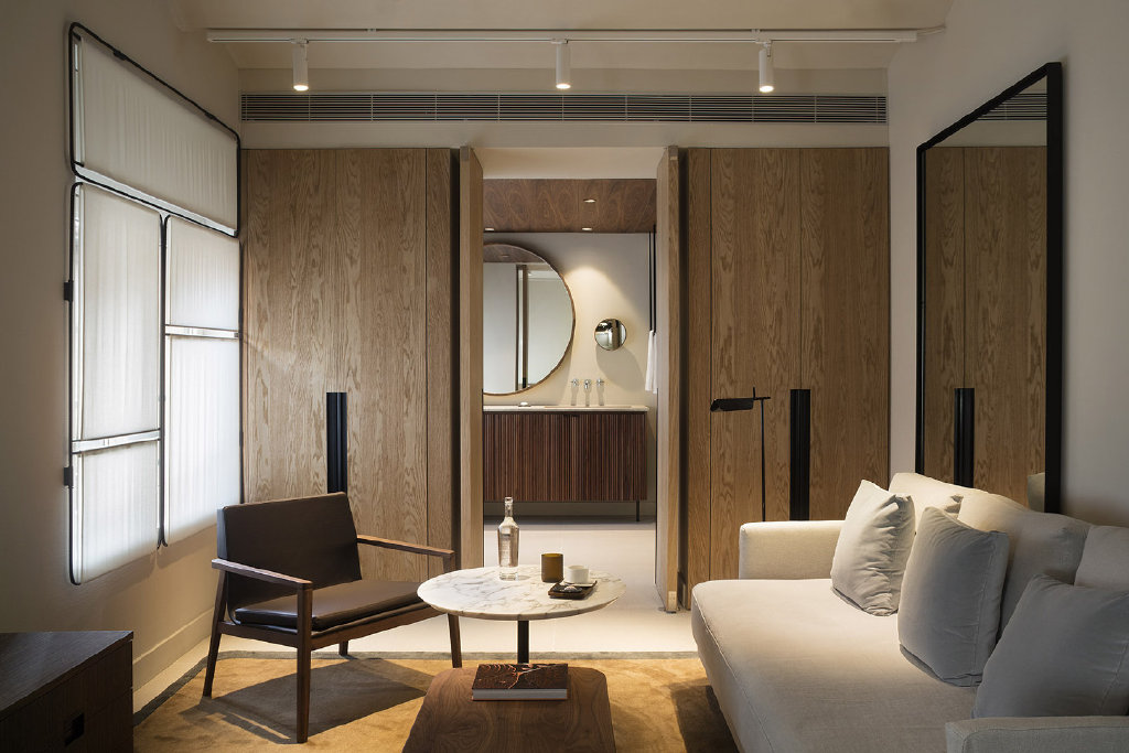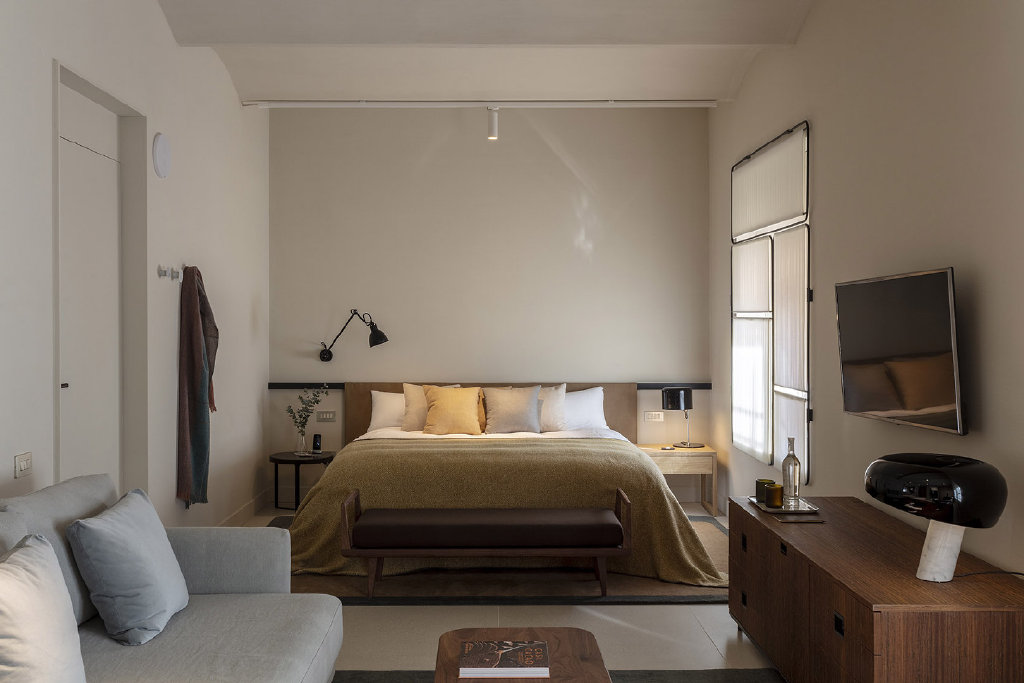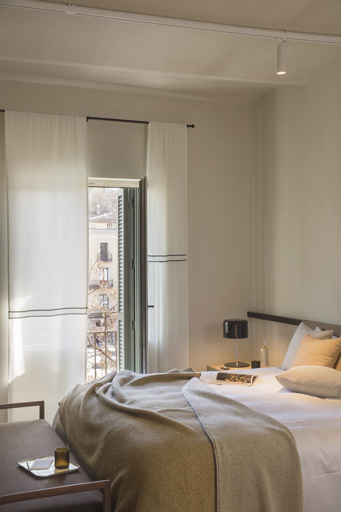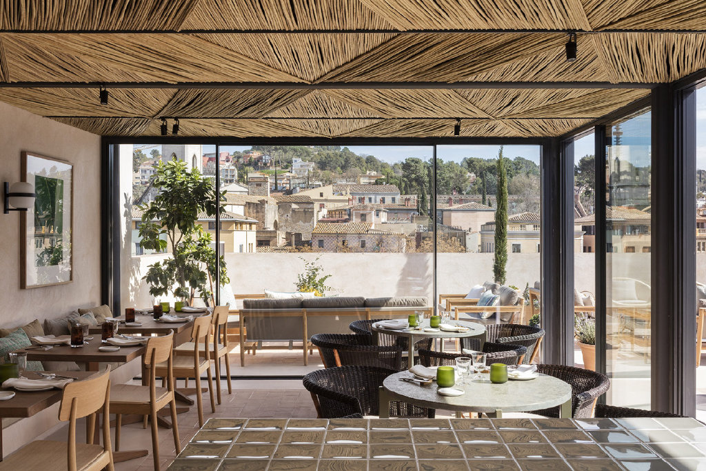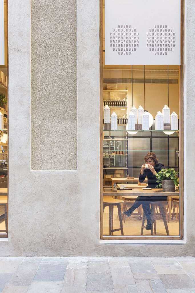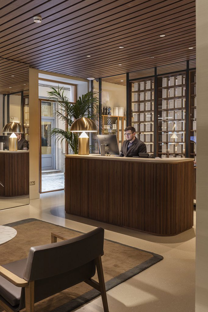 On the ground floor there is the preparation room, the hotel entrance, a chocolate shop and a product packaging and tasting room. The suites are located on the upper floors, and on the rooftop level, there is a landscaped terrace overlooking the old city quarters, where breakfast is served.
