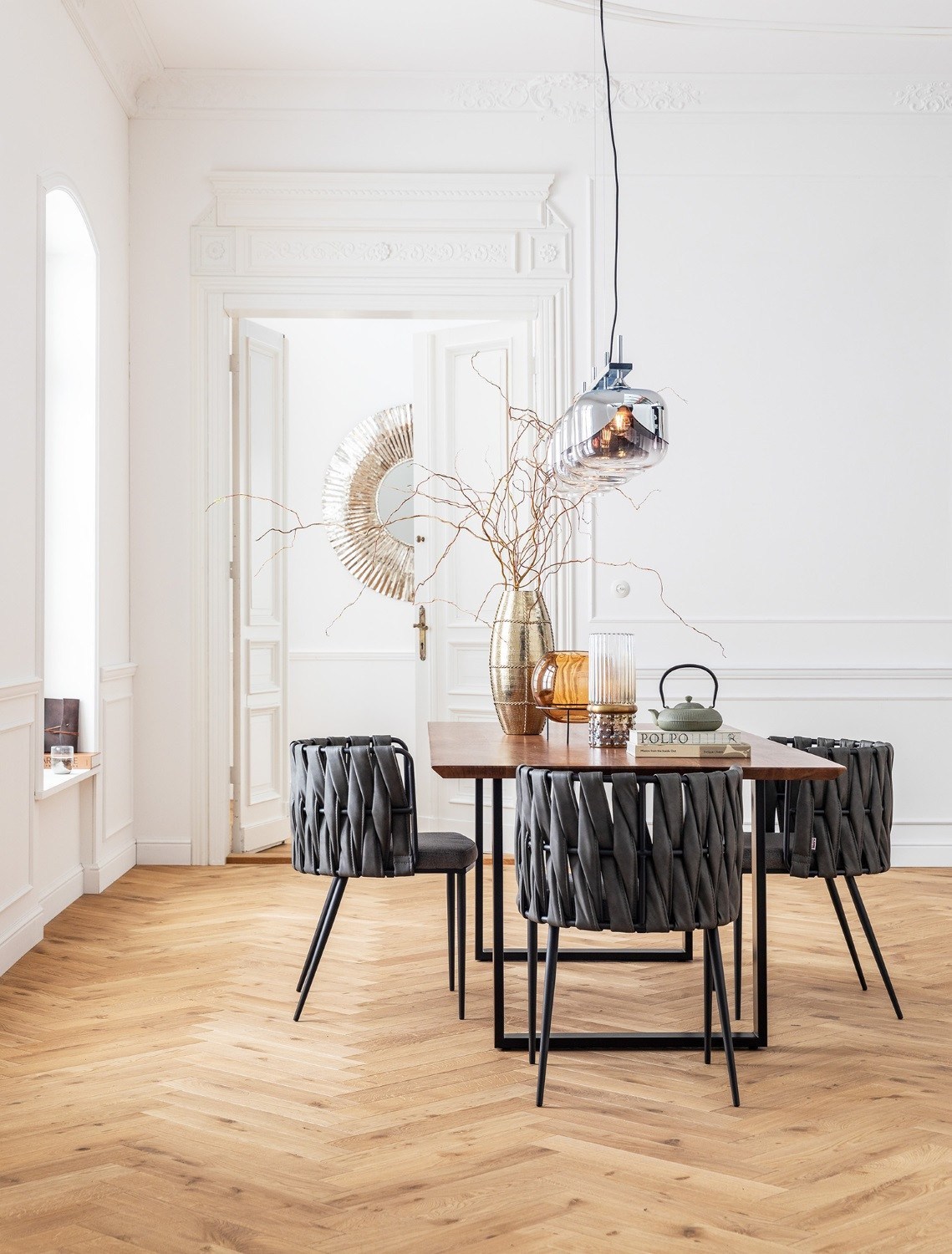 Kare’s elegant Symphony solid oak table with steel lacquered legs comes in various lengths and finishes. Shown here with Kare’s Cheerio chair in urban grey,
