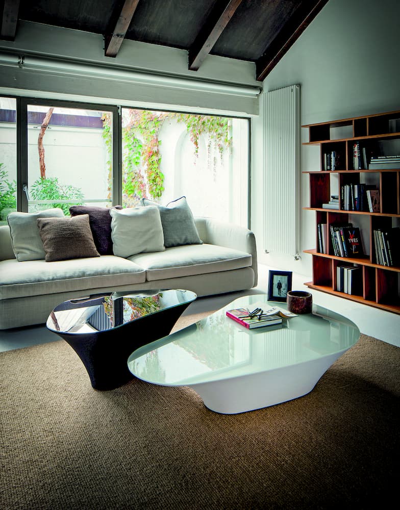 The Atollo coffee table from Cattelan Italia adds a modern touch to a living room. The tabletop comes in black painted glass or extra clear