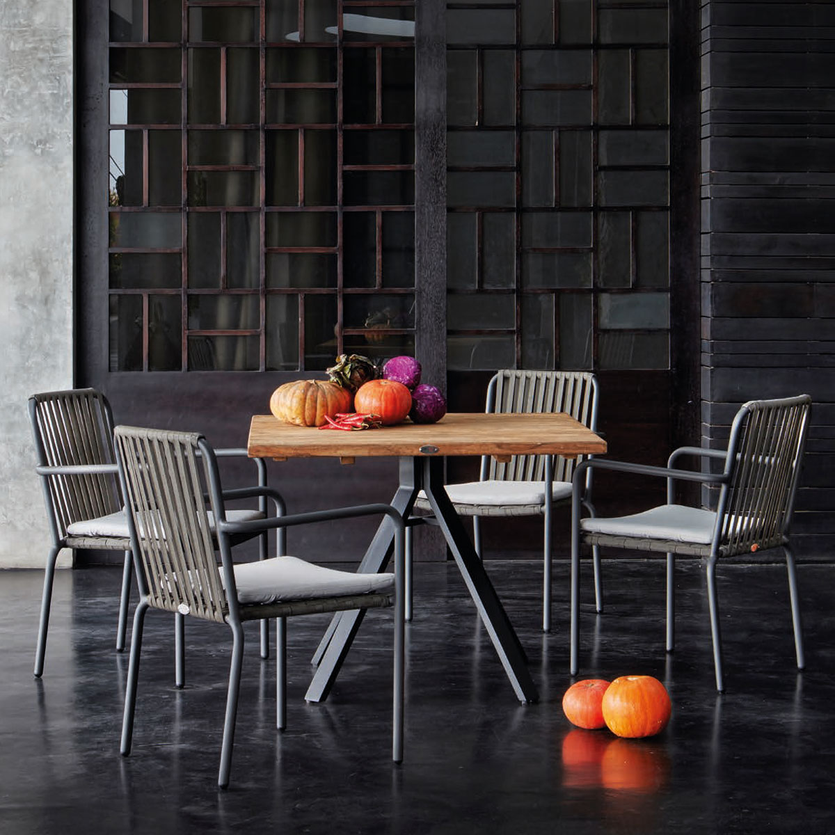 Skyline’s Alaska teak dining table and Trinity dining chairs can be used inside the home or outdoors on a terrace or in a garden.