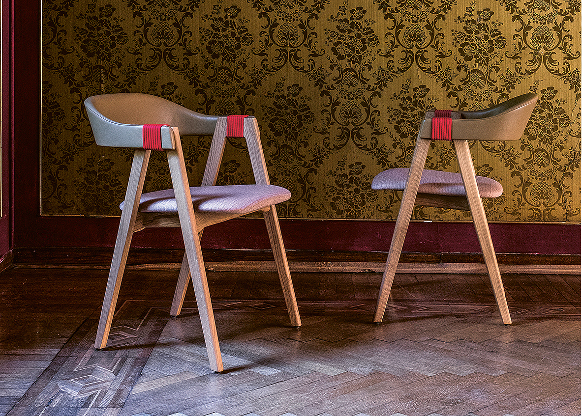 The Mathilda chair from Moroso is stackable, with ash or oak arms and legs. The arms are covered in either fabric or leather.