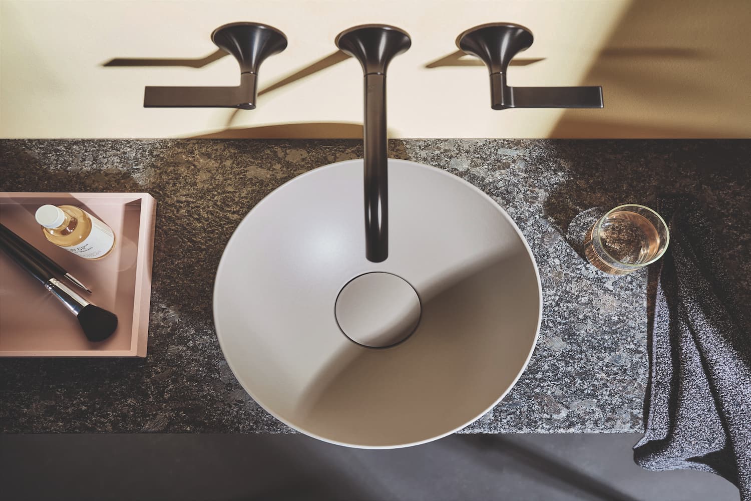 The contemporary Alape washbasin from Dornbracht, shown here in their Terra Silk Matt version, is made from glazed steel and comes in various colours andfinishes