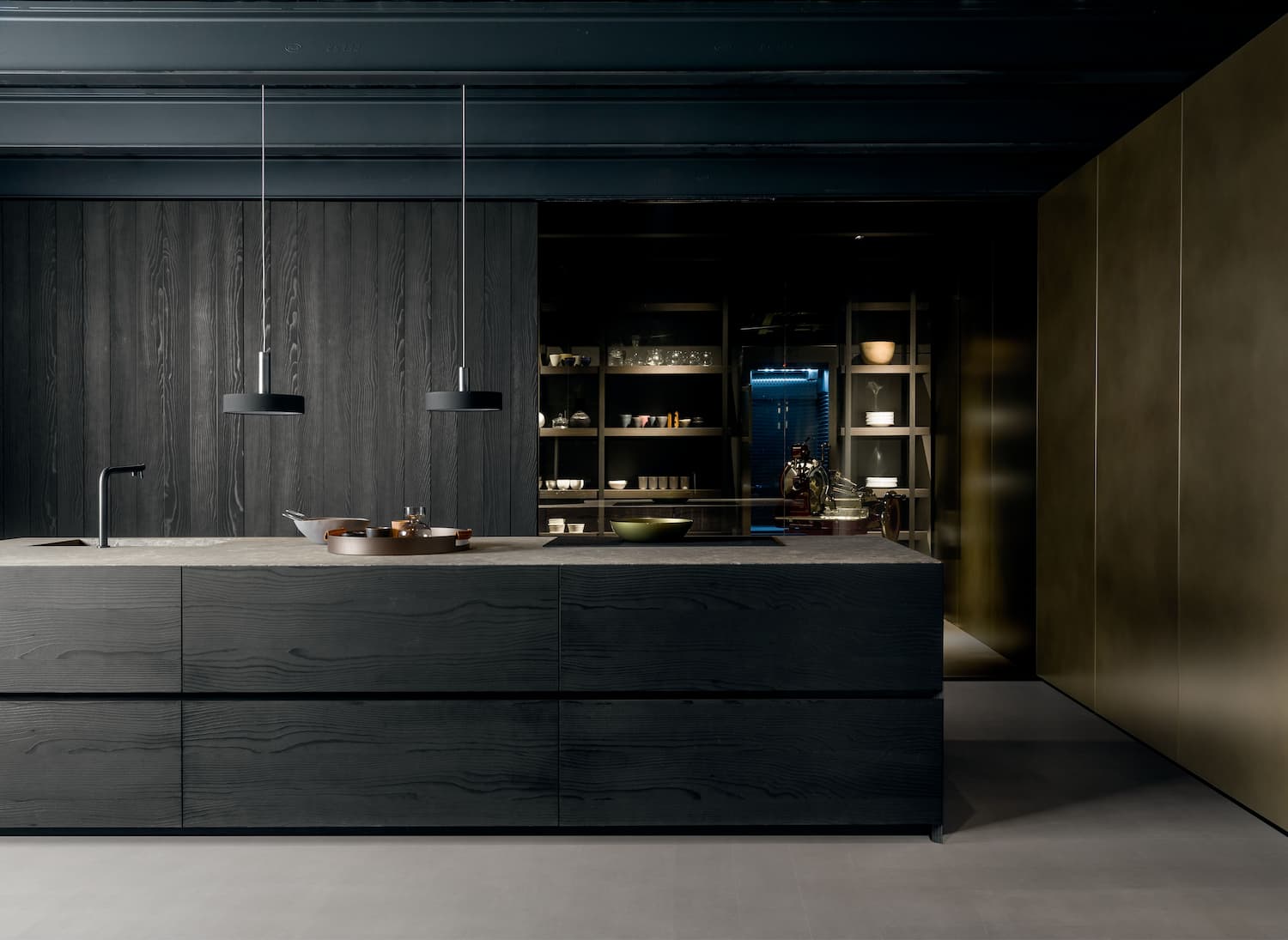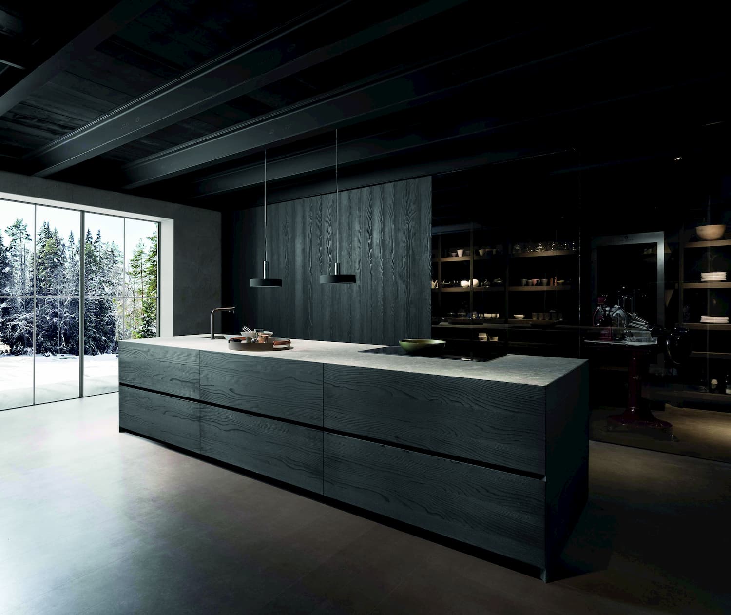 The refined and sophisticated Fly Float kitchen from Modulnova combines stone with wood, softening the minimalist formalism of the overall aesthetic whilst also using warm