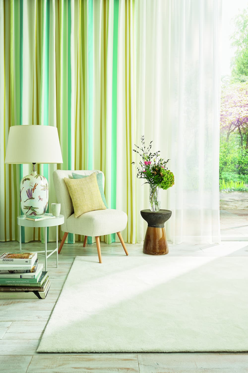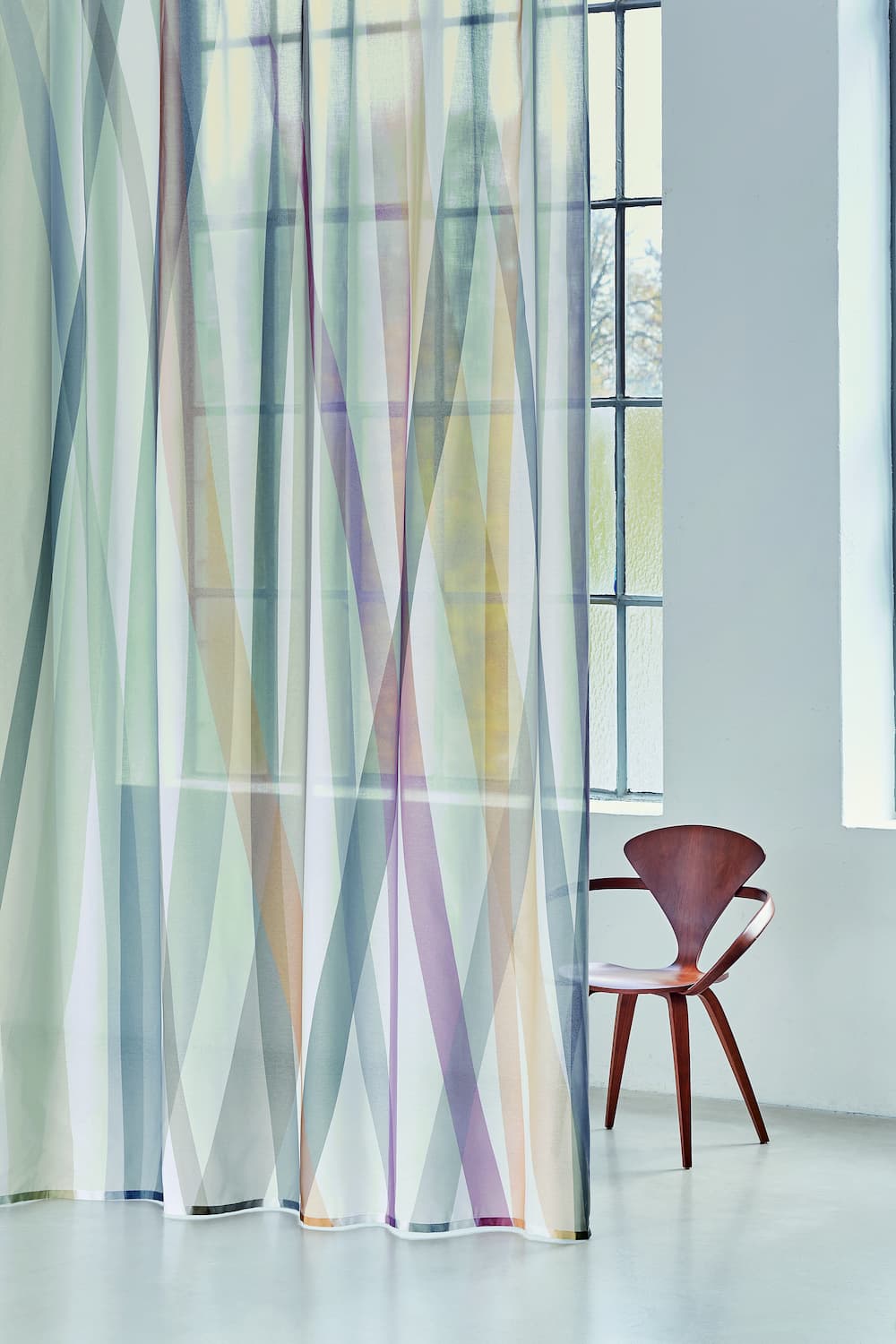 Création Baumann’s transparent Banda curtain fabric features a large-scale print design on their classic Sinfonia CS fabric. The multi-coloured graphic stripes draw the eye and
