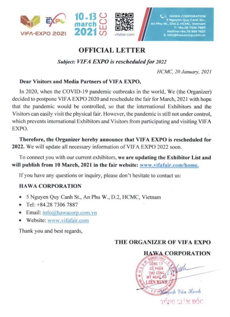 Therefore, The Organizer hereby announce that VIFA EXPO IS RESCHEDULED FOR 2022.
