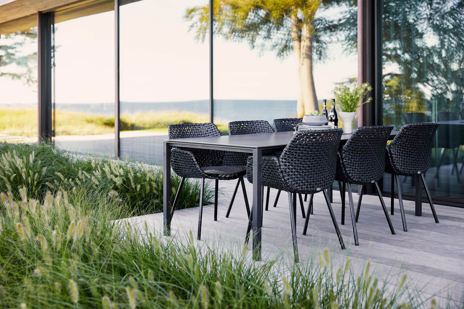 Cane-line’s Pure outdoor dining table made from ceramic, with an aluminium frame, perfectly complements their black Vibe dining chairs. The weaved back of the Vibe