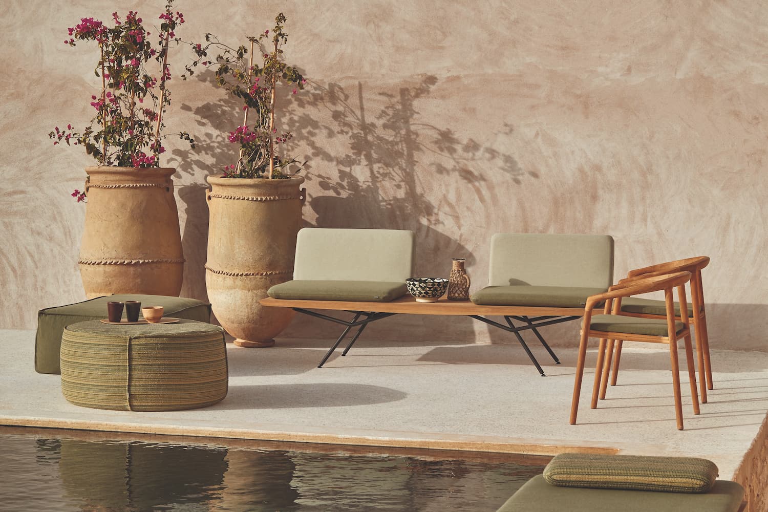 Manutti’s Solid armchair is made from natural teak and created in an elegant form. It is shown here with their Touch poufs and two-seater San