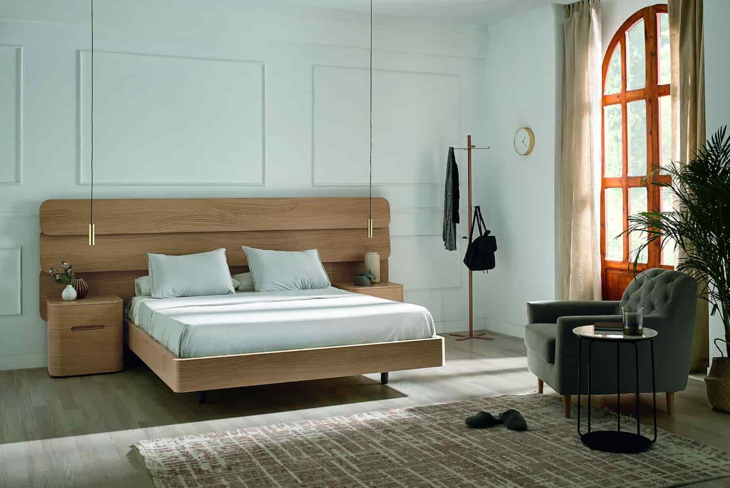 The Dodó bed has a headboard with horizontal slats that overlap vertically, similar to a roof and creating the feeling of being in a place