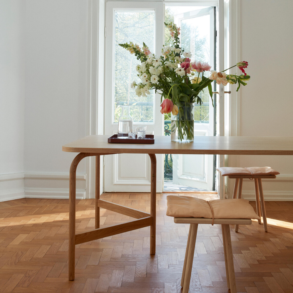 The Aldus table from Skagerakis a beautifully crafted rectangular model withsmooth rounded edges that can accommodate up to eight people. Shown here with their Georg Jubilee stool that combines Nordic sensuality with Japanese minimalist design. The unusual cushion made from aniline leather has a braided leather strap and is a simple but attractive