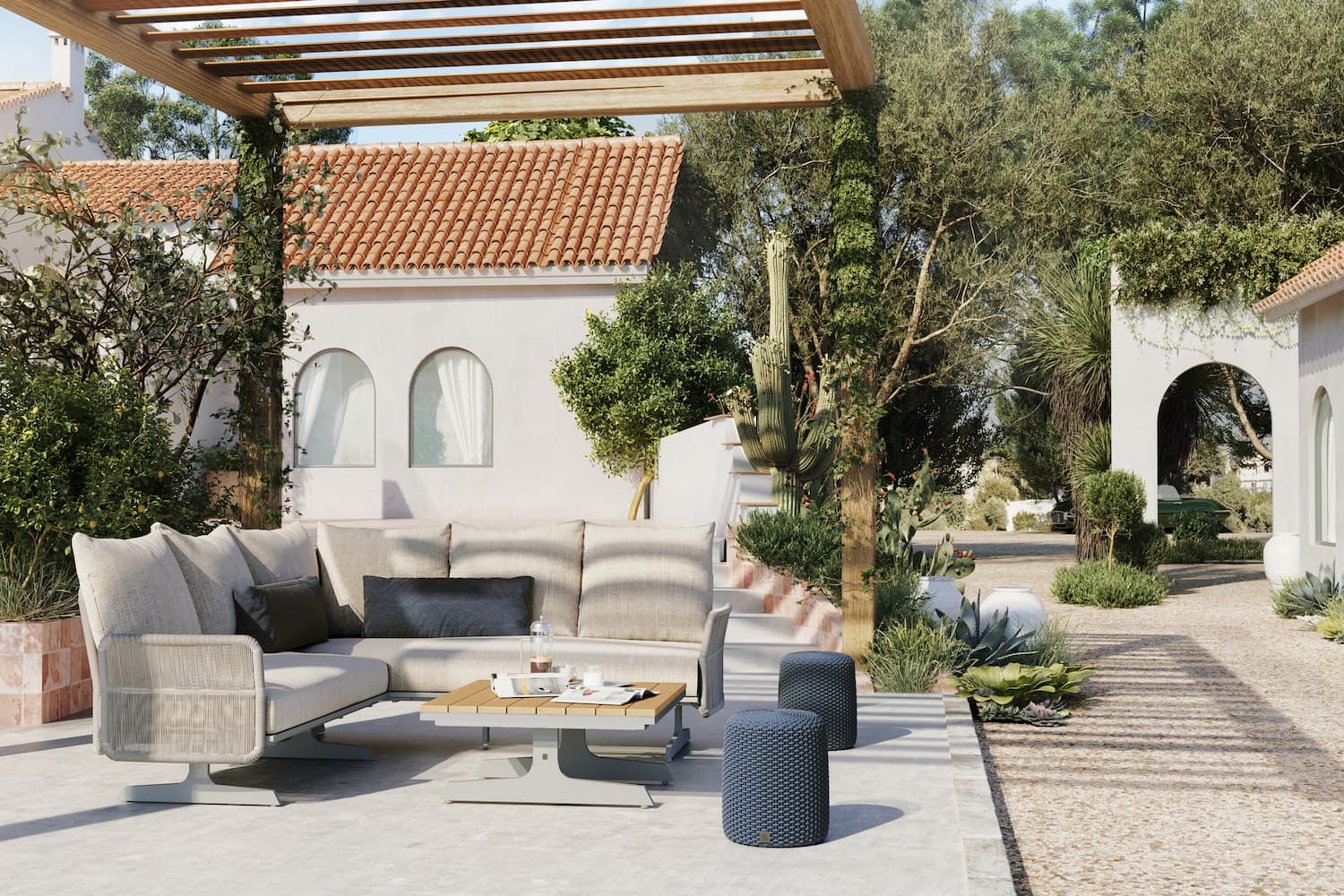 The Play modular lounge collection from 4 Seasons Outdoor comes with rope panels and comfortable matching back cushions. The Play Panel Concept Coffee Table with