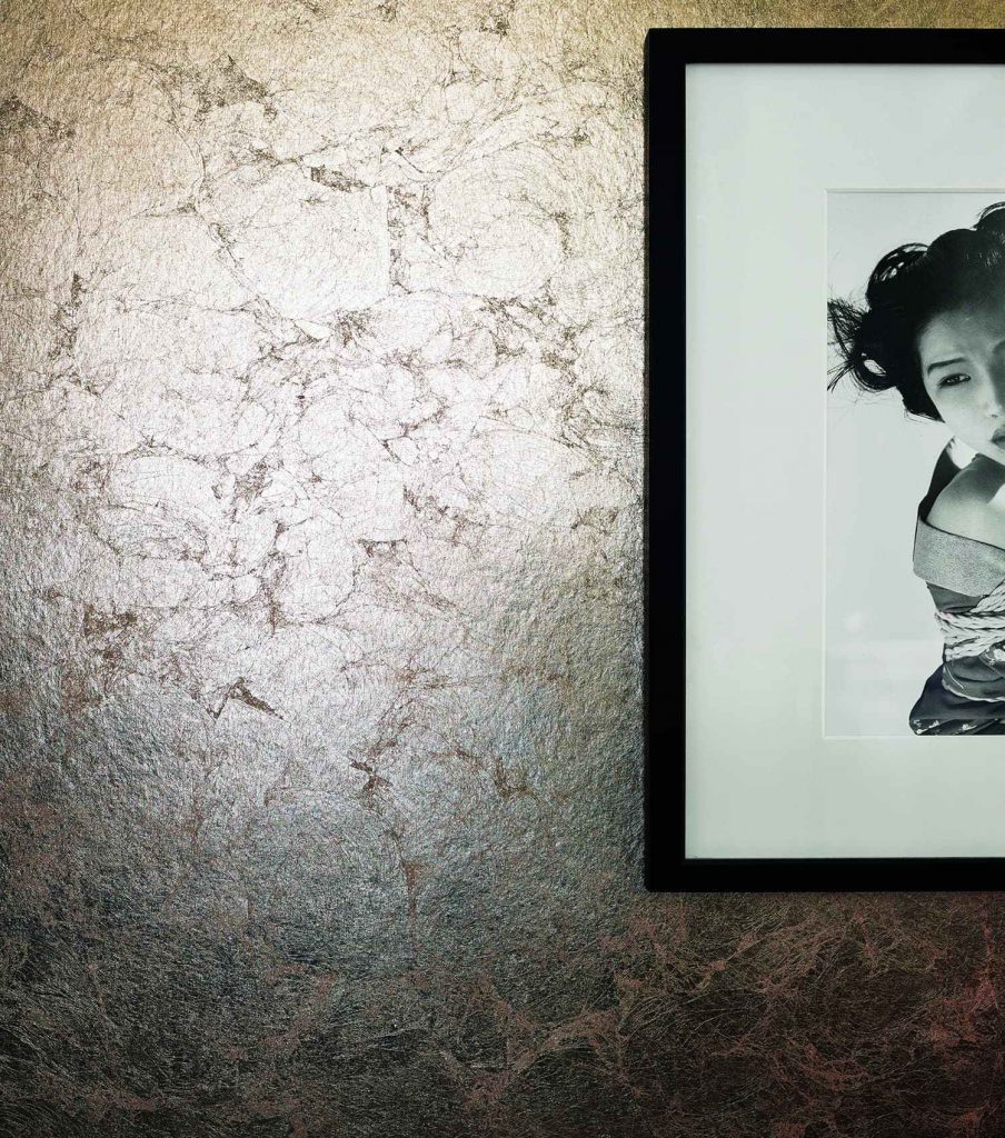 The Metallic collection by Misha Wallcoverings is made from hand-rolled metal leaf, providing an iridescent effect that is truly mesmerizing. Shown here is their 015 Palladio version.