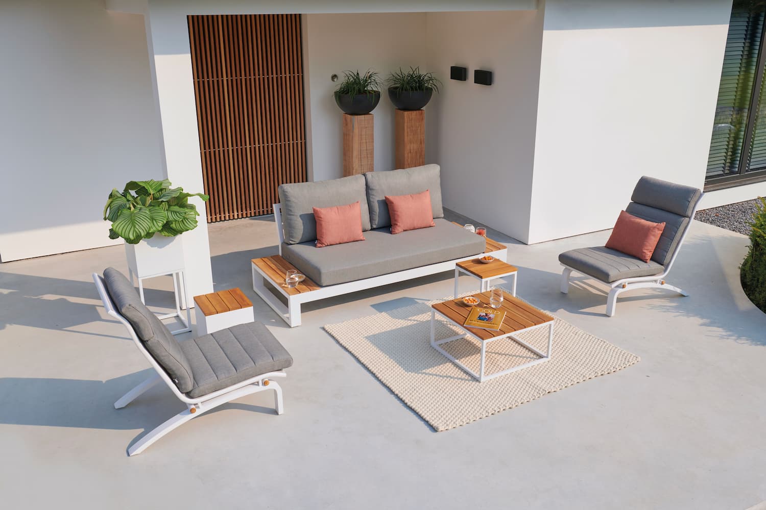 This lounge set combines teak and crisp white alumunium for a fresh and sleek contemporary look.
