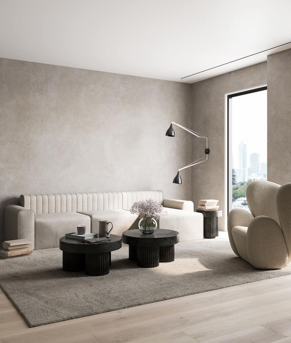 The Riff sofa and the Big Big armchair together with the Gear coffee and side table from Norr11 creates a coordinated minimalistic look with soft