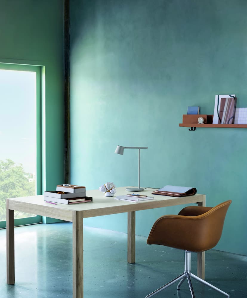 Muuto’s Fiber Armchair is a contemporary swivel chair that is like a shell embracing the user. Shown here with their 70/70 Table, which has an