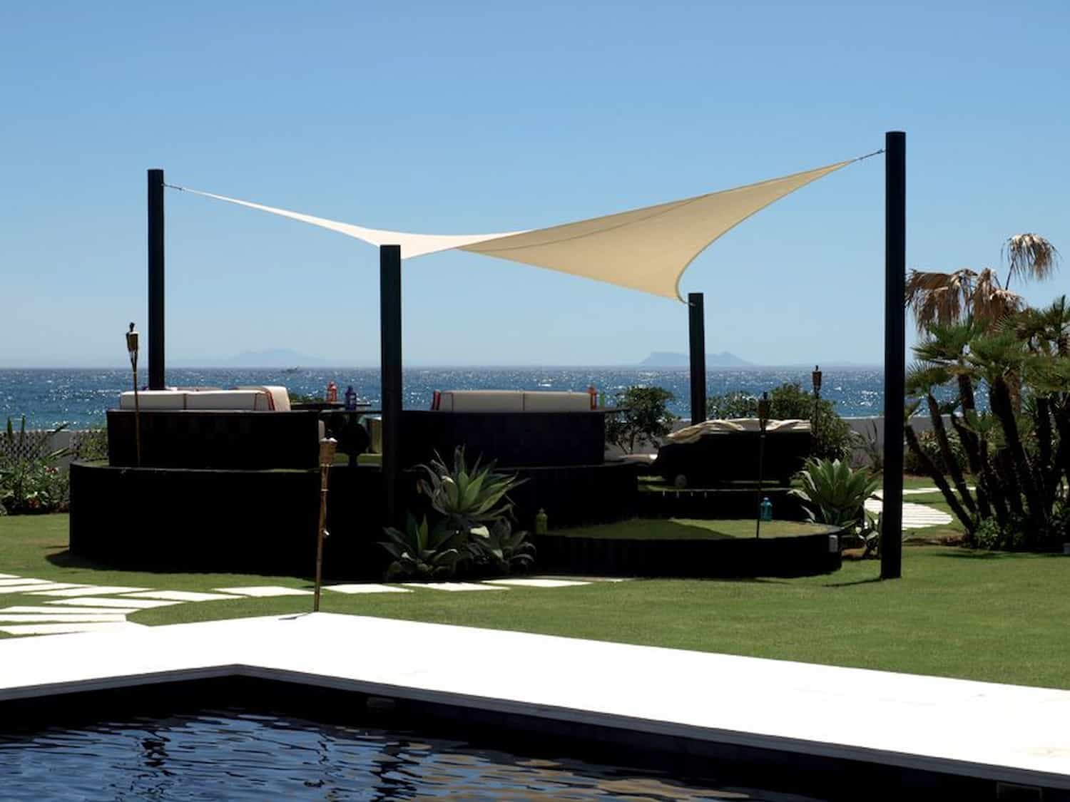 This shade sail has been made-to-measure to perfectly accommodate the seating area below it. Shade sails come in a variety of colours to suit your