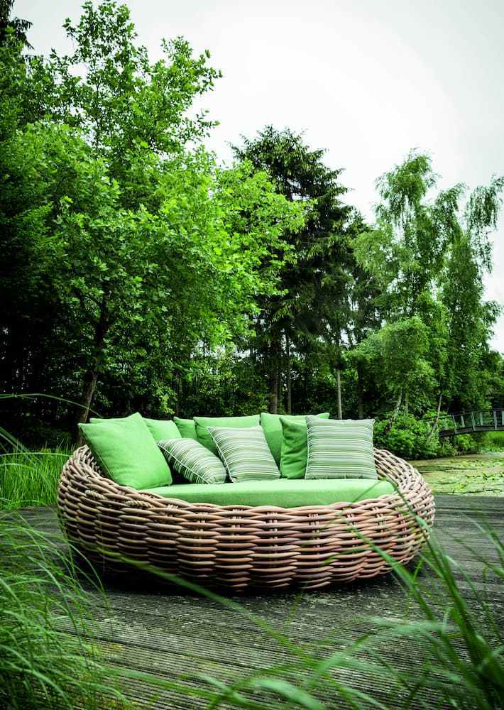 The Apple Bee Cocoon daybed has large green lounge cushions – optionally with Bee Wett® technology – with thick woven Biculair® weave thread of up