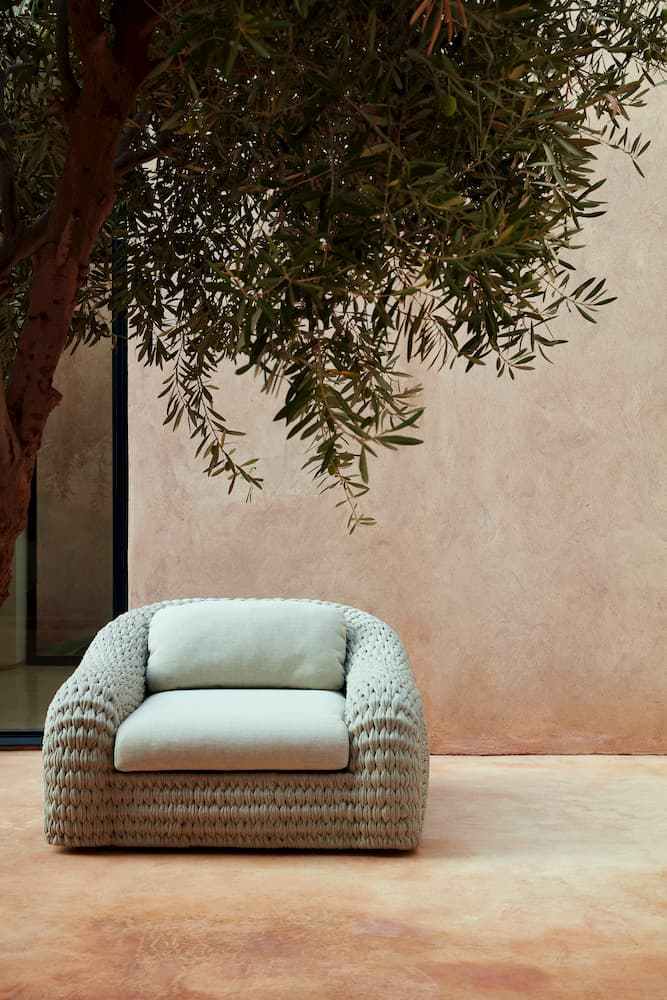 Manutti’s Kobo collection is made entirely of hand-woven rope around a welded aluminium frame. The deep armchair with its beautiful curved lines invites you to