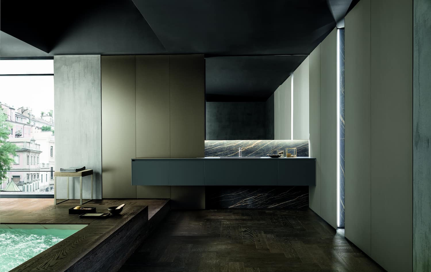 The Twenty Bath collection from Modulnova combines compositional lightness with functionality. The large suspended block, with bromine grey Fenix base units, top and integrated washbasin,