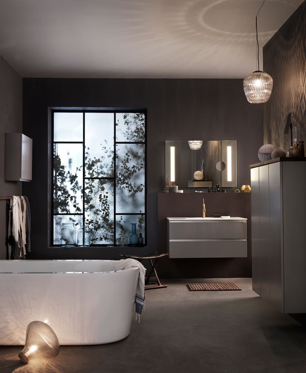 This bathroom by Swedish designers Ballingslöv offers sleek grey cabinetry with a porcelain washbasin and brass mixer tap for a touch of glamour.