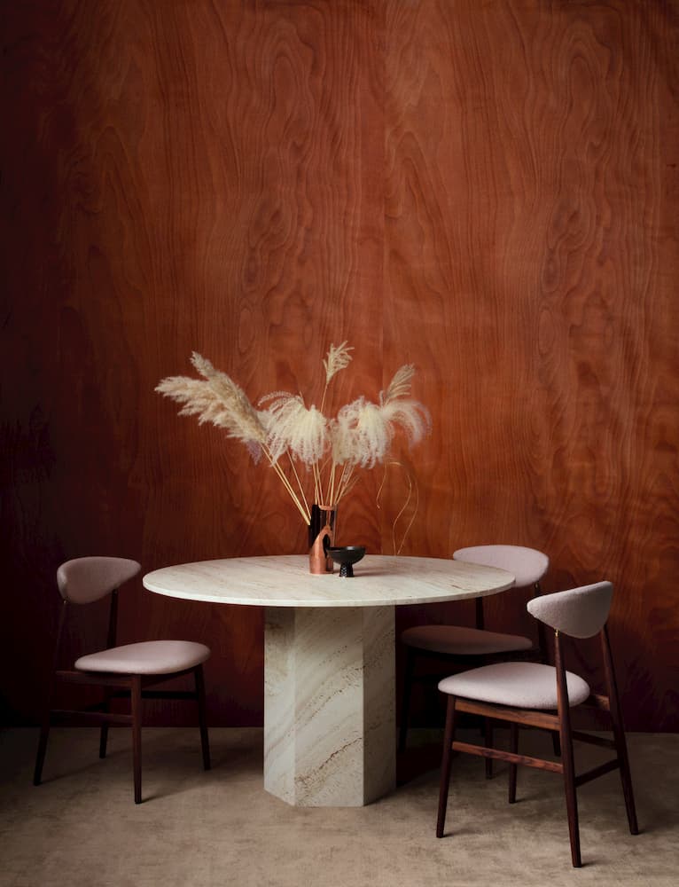 Gervasoni’s Next circular table has a cast aluminium base and Carrera marble tabletop with anti-fingerprint frosted glass. It is shown here with their Brick chair,