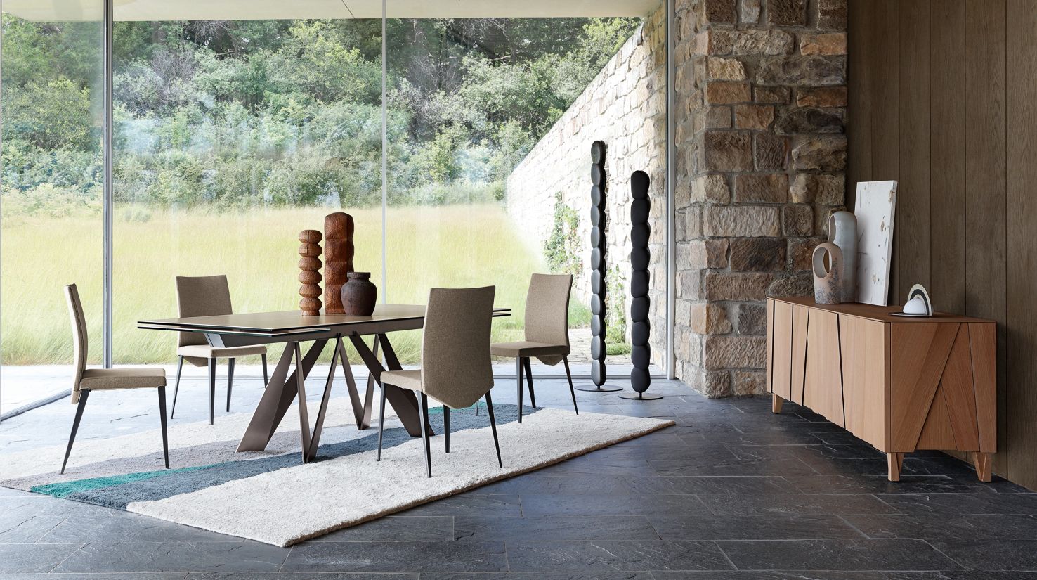 The Cigale dining table from Roche Bobois is extendable with a ceramic and glass top with the base and crossbar in steel. Accompanied here with
