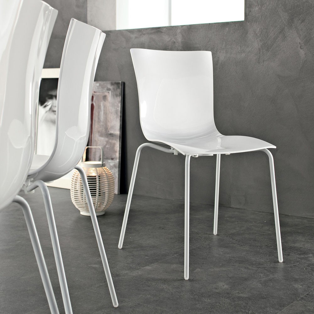 The Aria Easy stackable dining chair is made of a plymeric moulded body and chromed or lacquered metal legs. A transparent seat gives this chair