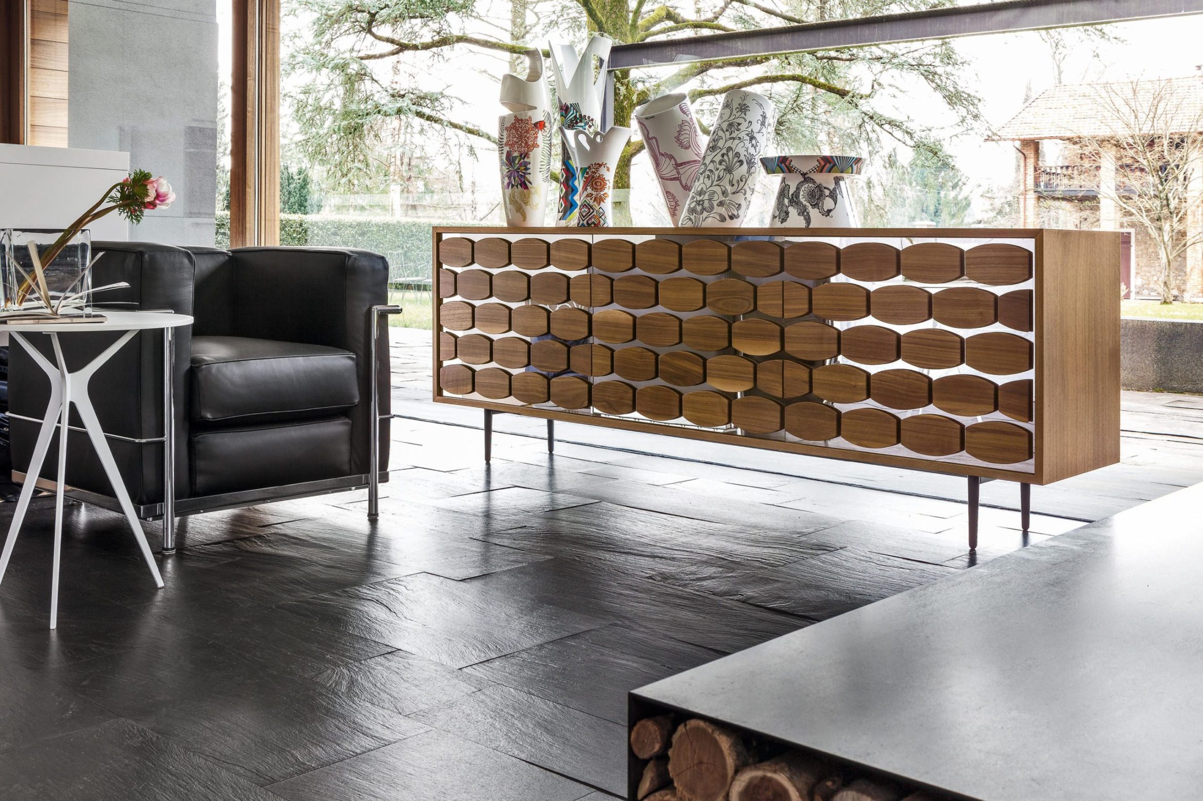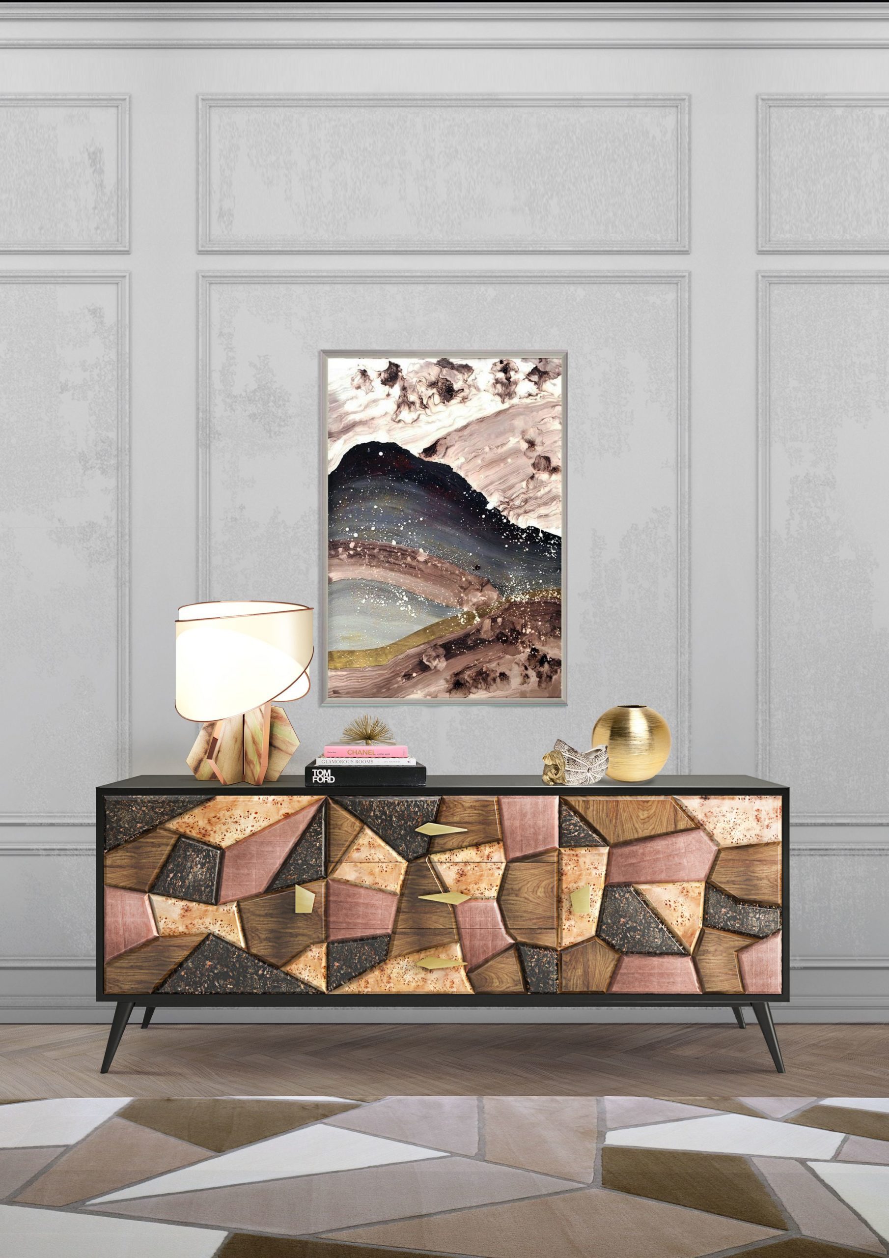 Muranti’s Topaz sideboard has geometric lines, exotic woods and copper leaf to give it the wow-factor.