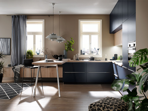 This kitchen by Häcker combines sand oak wood countertops with velvet blue lower cabinetry for a contrasting look.
