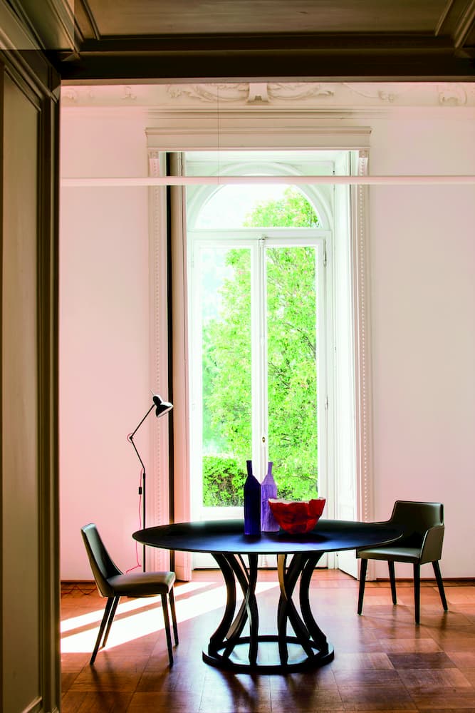 The Dorico 3030 dining table from Bross features a solid oakwood base in a natural, stained or matte lacquered finish, and comes with a round