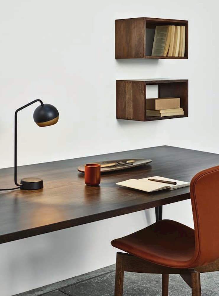 Mater Design’s Shell chair features soft leather upholstery and was designed by Michael Dreeben, who collaborated with Danish leather supplier Sorensen Leathers. Their Box System