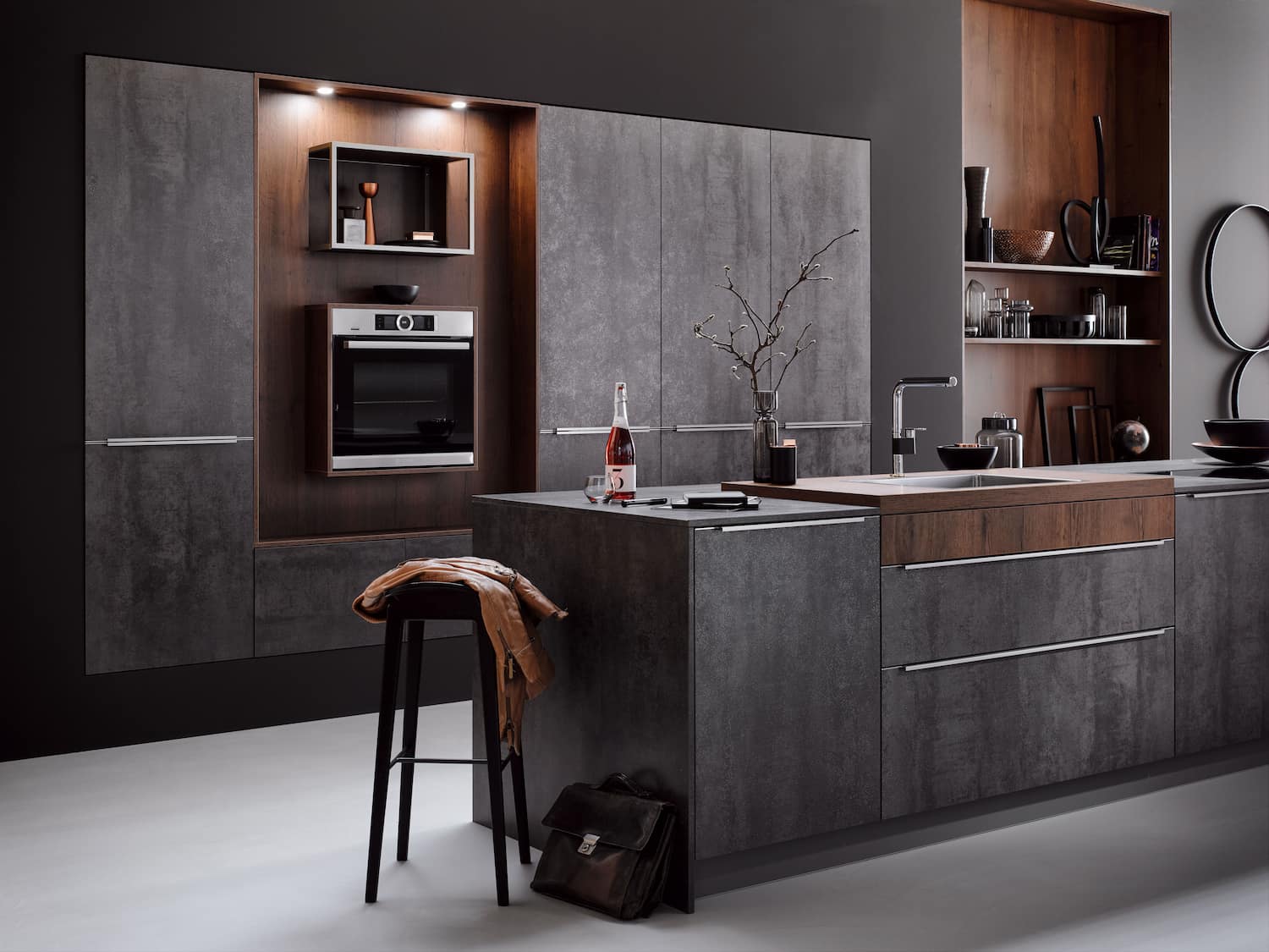 The Iron Grey kitchen range from Häcker contrasts natural wood with real lava stone for a sophisticated overall look. Novo Küchen is an official retailer