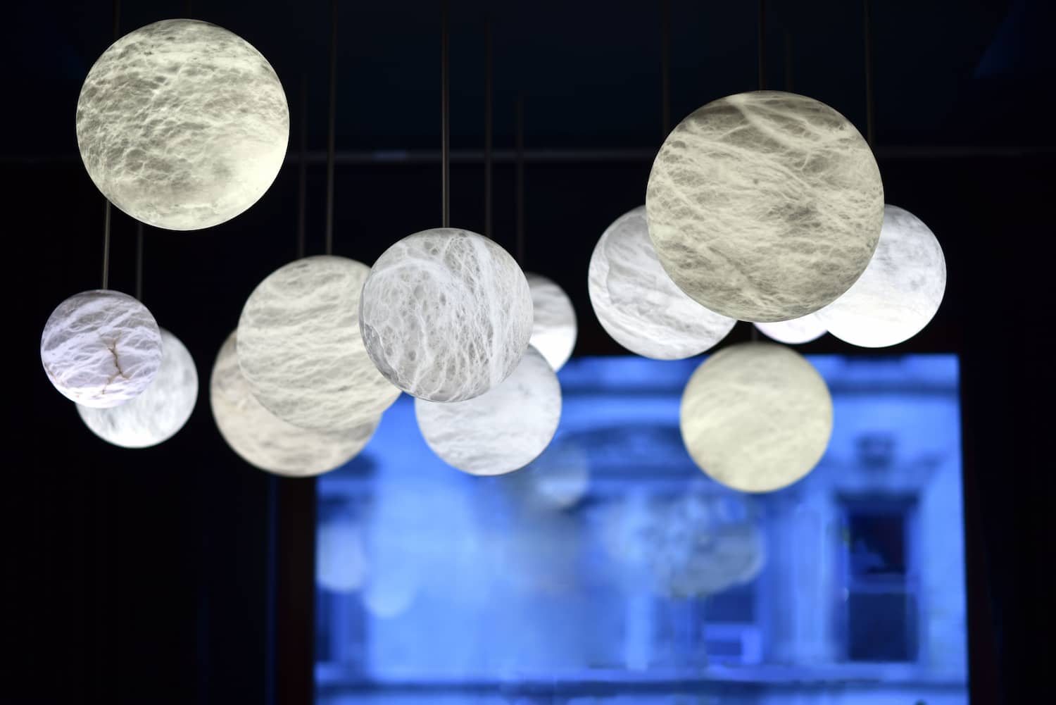 Atelier Alain Ellouz’s iconic suspension lamp, the Luna, is highlighted by its simplicity. It is available in varying lengths and, when clustered at different heights,