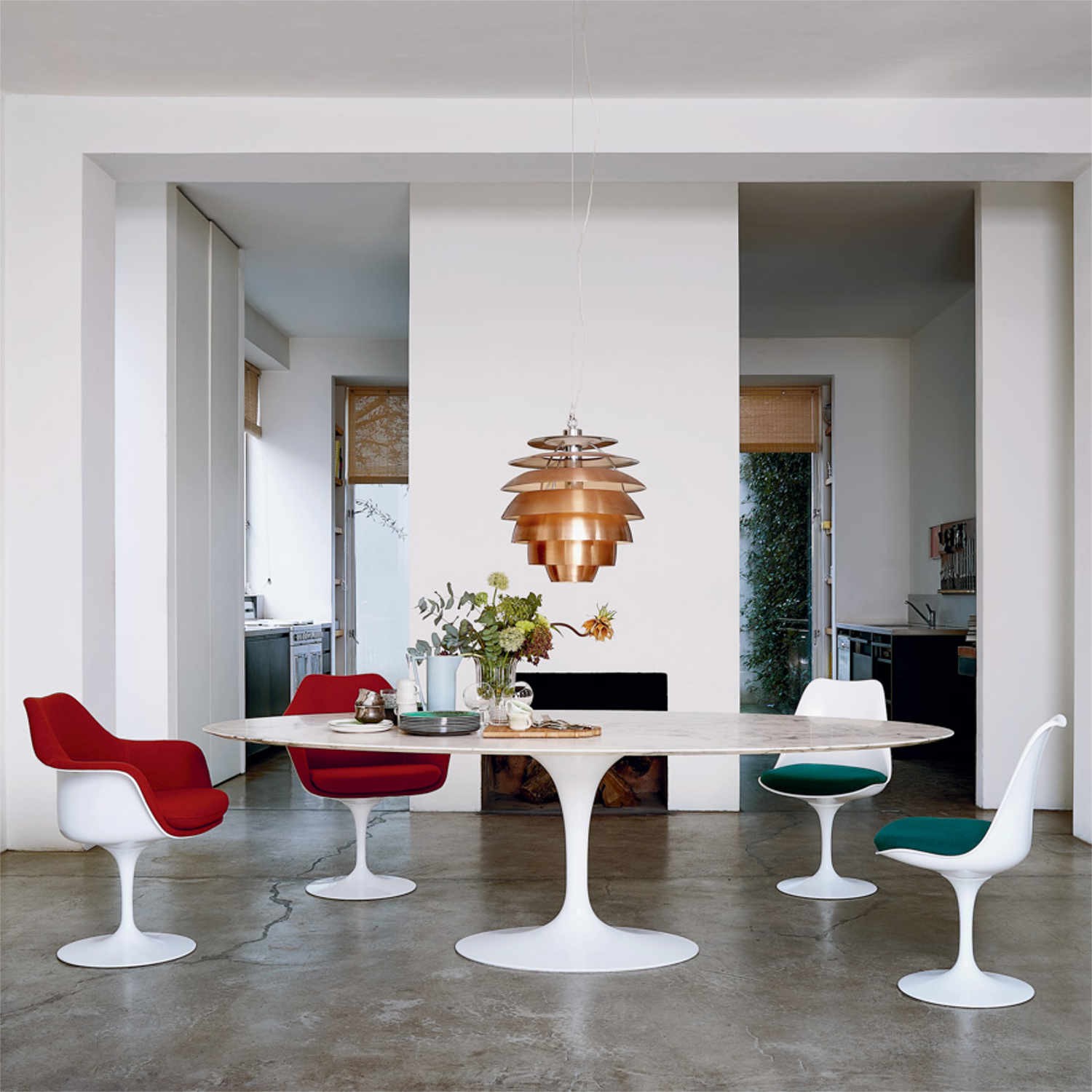 Knoll’s Saarinen oval dining table from their Pedestal collection comes in a number of different tabletop finishes – and is shown here with Knoll’s iconic