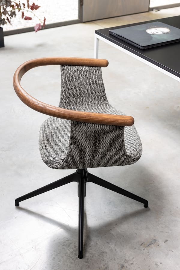 The enveloping design of Yuumi by Bross Italy is rendered by a shell upholstered in fabric, but it is also available in leather, as well
