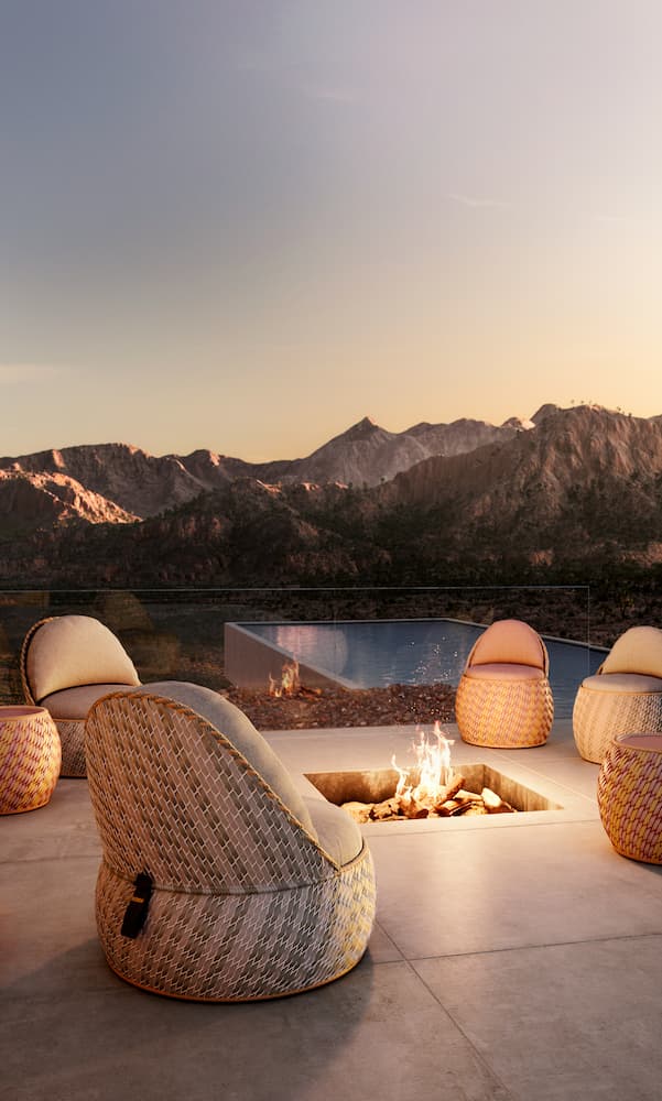 Sebastian Herkner’s award-winning Mbrace collection for Dedon combinesteak, woven fibre and an optional diecast aluminium base. The collection hasmany elements and all the chairs feature