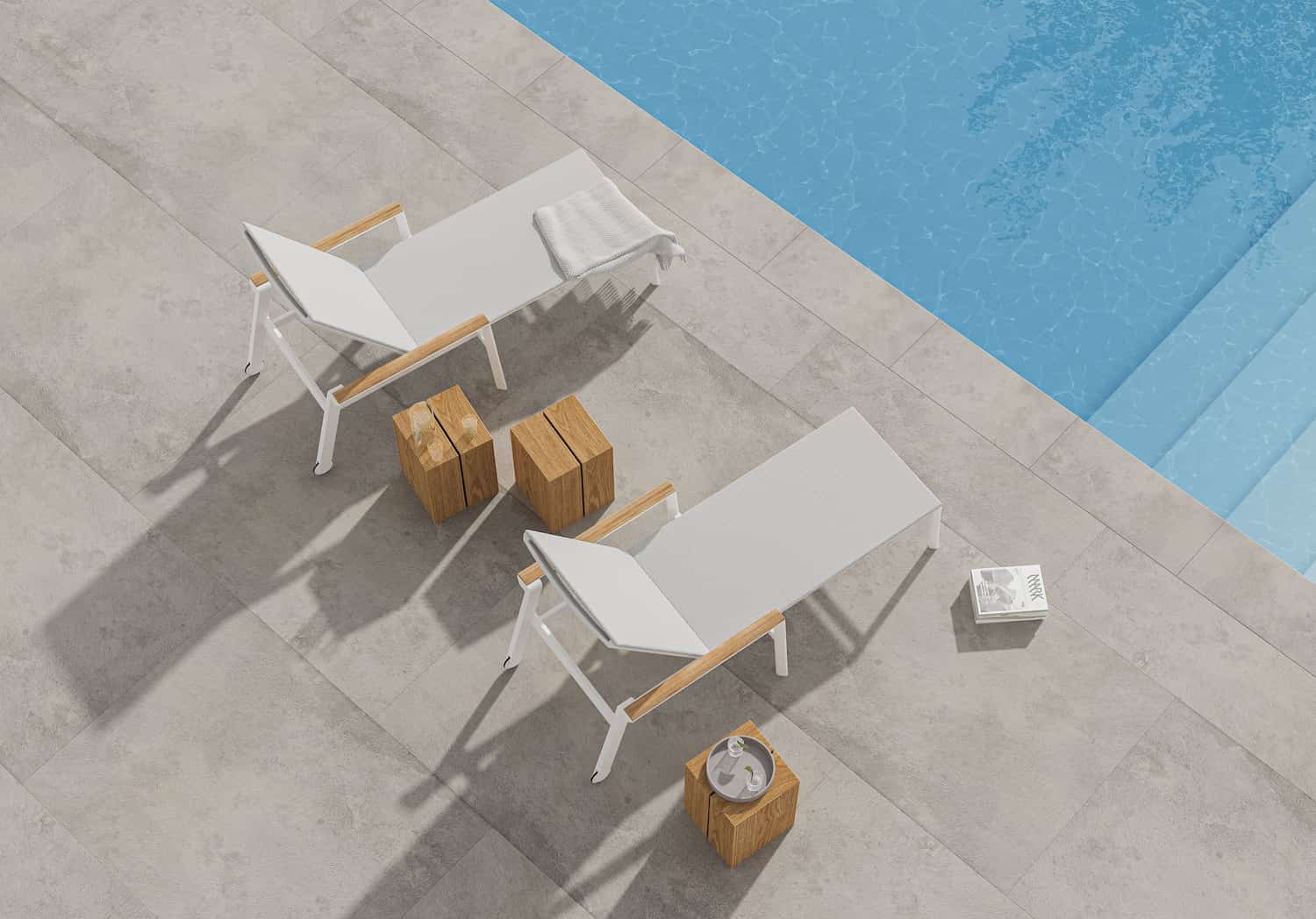 Designed by Klaus Nolting, the stackable Spa lounger has a powder-coated aluminium frame, teak armrests and quick-dry Softex fabric. The bed is higher than standard