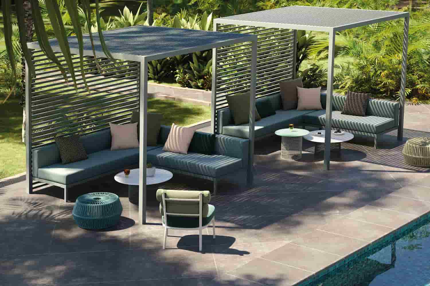 Kettal’s Lounge Pavilion comes in a wide range of colours and can be personalised and configured with blinds, net curtains, panels and ceilings.