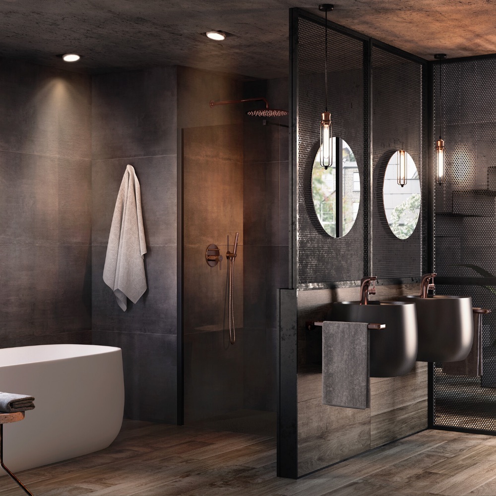 This bathroom from Roca shows how bathrooms do not always have to be sterile and bright. Dark features can look chic and urban, with metallic