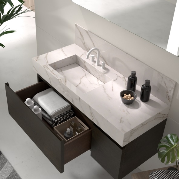 The Must bathroom furniture collection offers a compact modular range of marble, porcelain or solid surface countertops with drawers. It comes in a wide range