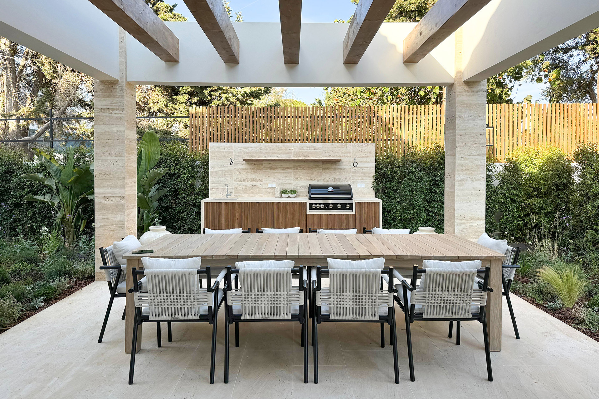Designed by G&G Italia, the Hampton dining armchair is expertly crafted with a durable aluminium frame and intricately woven outdoor rope, offering both strength and