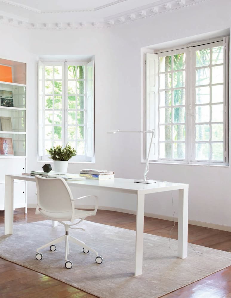 The Gas swivel chair from Stua is height-adjustable and comes on casters for easy manoeuvrability. It is shown here with their Deneb minimalist table, which
