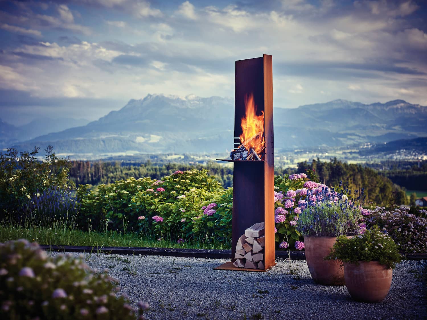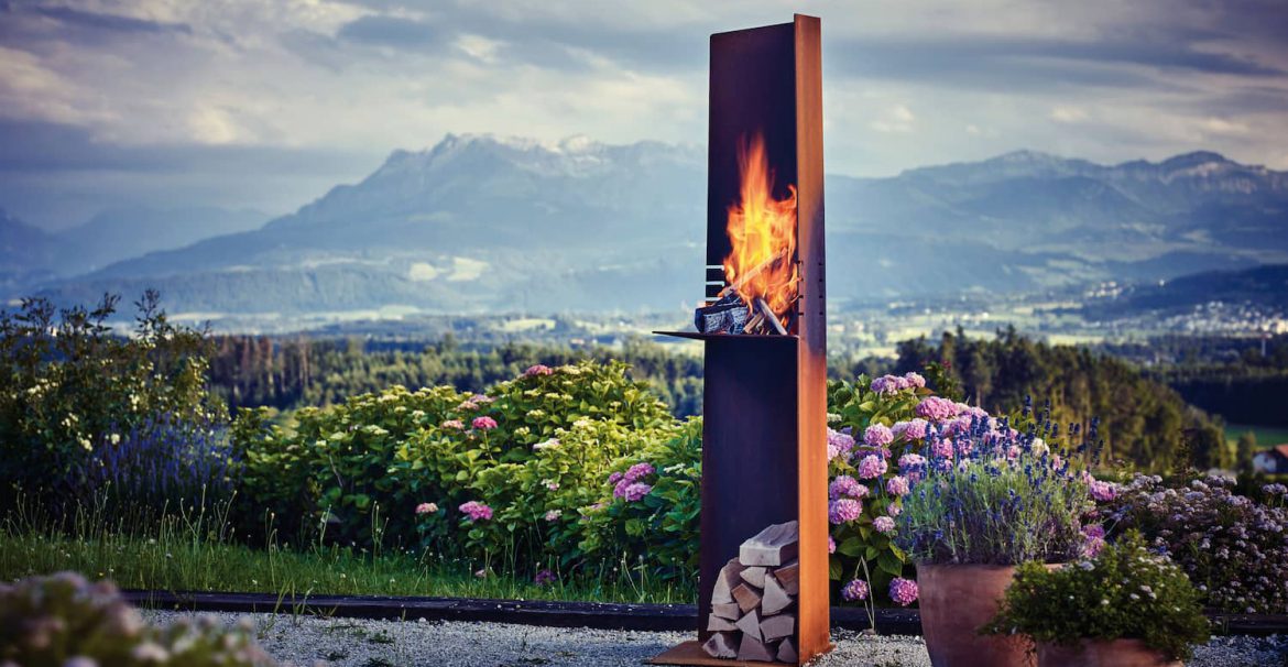 The Angle outdoor fire pit is made from high-quality Corten steel that has been rusted to create an eye-catching sculptural feature for an outdoor space.