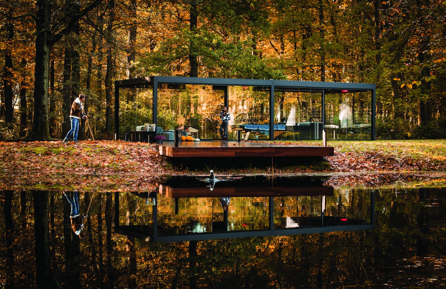 The Camargue Skye pergola from Renson has roof blades which can slide completely open and rotate to control the amount of venti – lation and