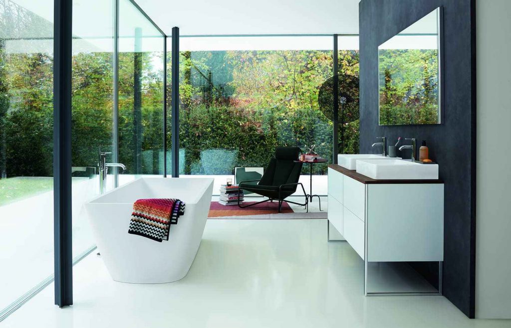 The XSquare bathroom furniture range from Duravit combines different materials to produce something quite new. The cabinetry and vanity units have wooden finishes and contrast with the striking chrome features, giving the overall look a luxurious contemporary aesthetic.