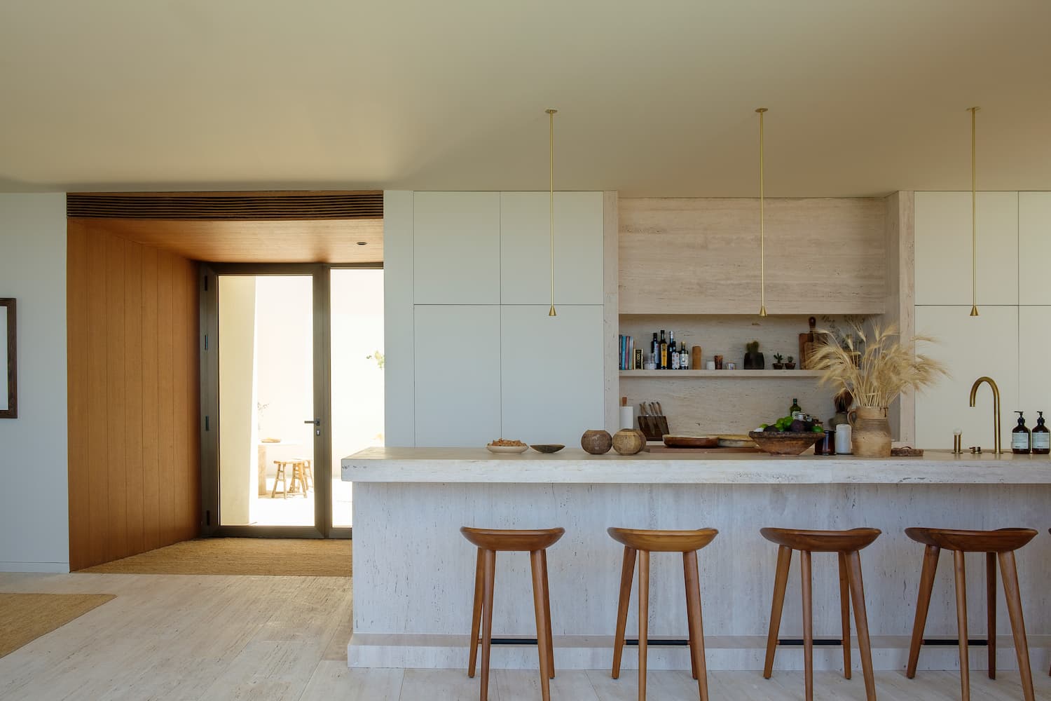 This contemporary-style kitchen was designed entirely by MT Interiors. It comprises Travertine natural stone and the cabinets were hand-painted to achieve the desired colour and