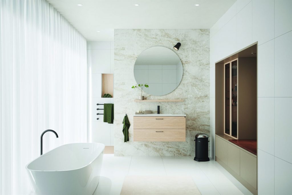 The bathroom furniture featured here is all supplied by Ballingslöv. The Bright Oak cabinet is made from a white pigment and composite Stine, Blanco Zeus Extreme. Their Tapwell matte black faucet and IPS6 wall lamp provide good contrast against the white ceramics, while the oversized mirror brings a strong focus to the room and reflects natural light.