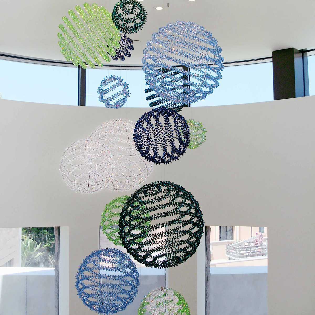 Windfall’s Blowing Bubbles collection features floating crystal spheres that appear like glittering comets. Made using Windfall’s Hellbob technique, these modular spheres can be arranged in